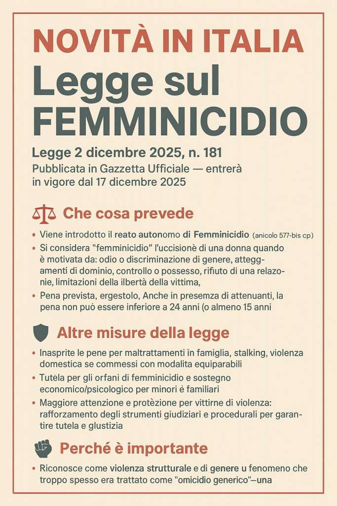 NOVITÀ IN ITALIA — Legge sul FEMMINICIDIO