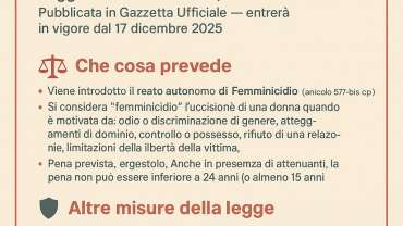 Perché conoscere la legge significa poterla fare rispettare. NOVITÀ IN ITALIA — Legge sul FEMMINICIDIO Legge 2 dicembre 2025, n. 181 Pubblicata in Gazzetta Ufficiale — entrerà in vigore dal 17 dicembre 2025 Che cosa prevede? Viene introdotto il reato autonomo di Femminicidio (articolo 577-bis c.p.) Si considera “femminicidio” l’uccisione di una donna quando è motivata da: odio o discriminazione…